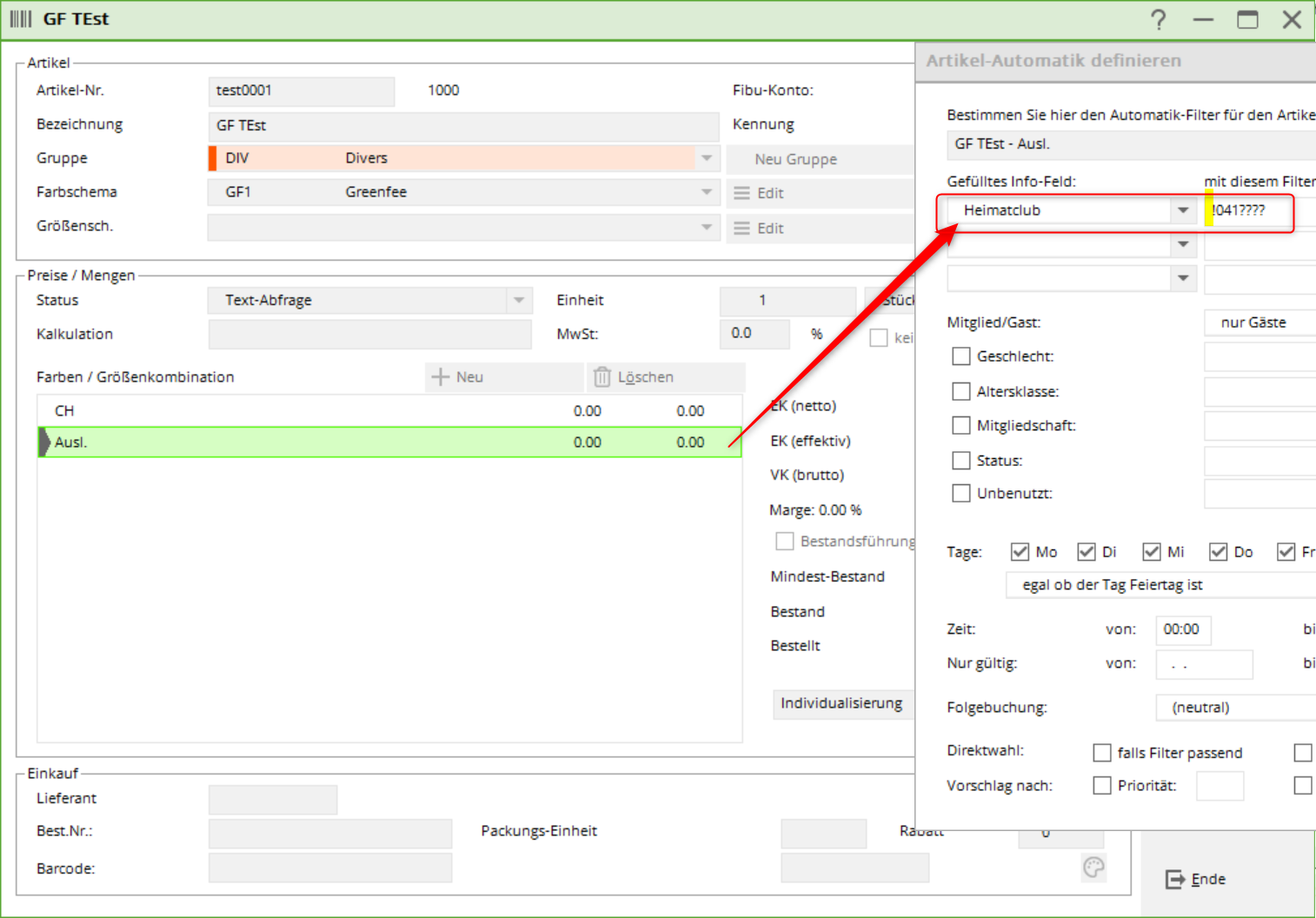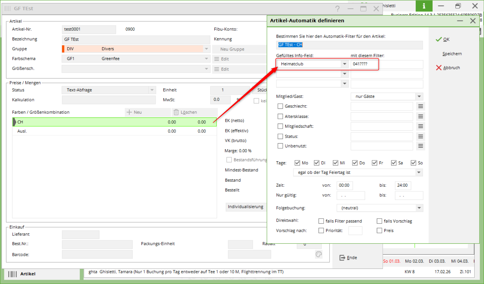 Wenn für Mitlgieder mit einem Schweizer Homeclub ein anderer Preis gilt, als für Spieler mit ausländischem Homeclub kann das in der Artikelautomatik wie folgt eingegeben werden.