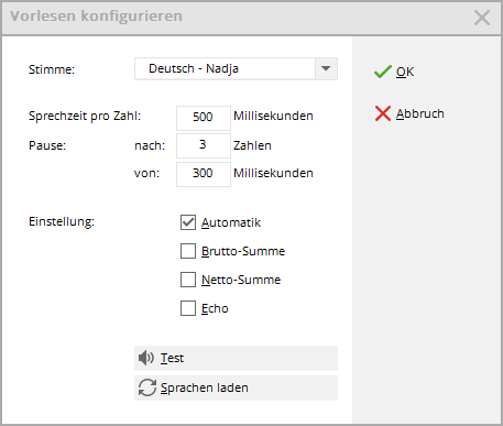 Wenn „Automatik“ angehakt ist, startet das Vorlesen direkt nach Eingabe des letzten Ergebnisses.