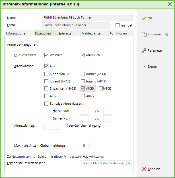 Schränken Sie hier so wenig wie nötig ein. Die Handicapgrenze der Hauptturniermaske wird direkt in diese Maske übertragen und kann hier weiter verarbeitet werden. Achten Sie sehr genau darauf, dass die nötigen Felder korrekt ausgefüllt sind.