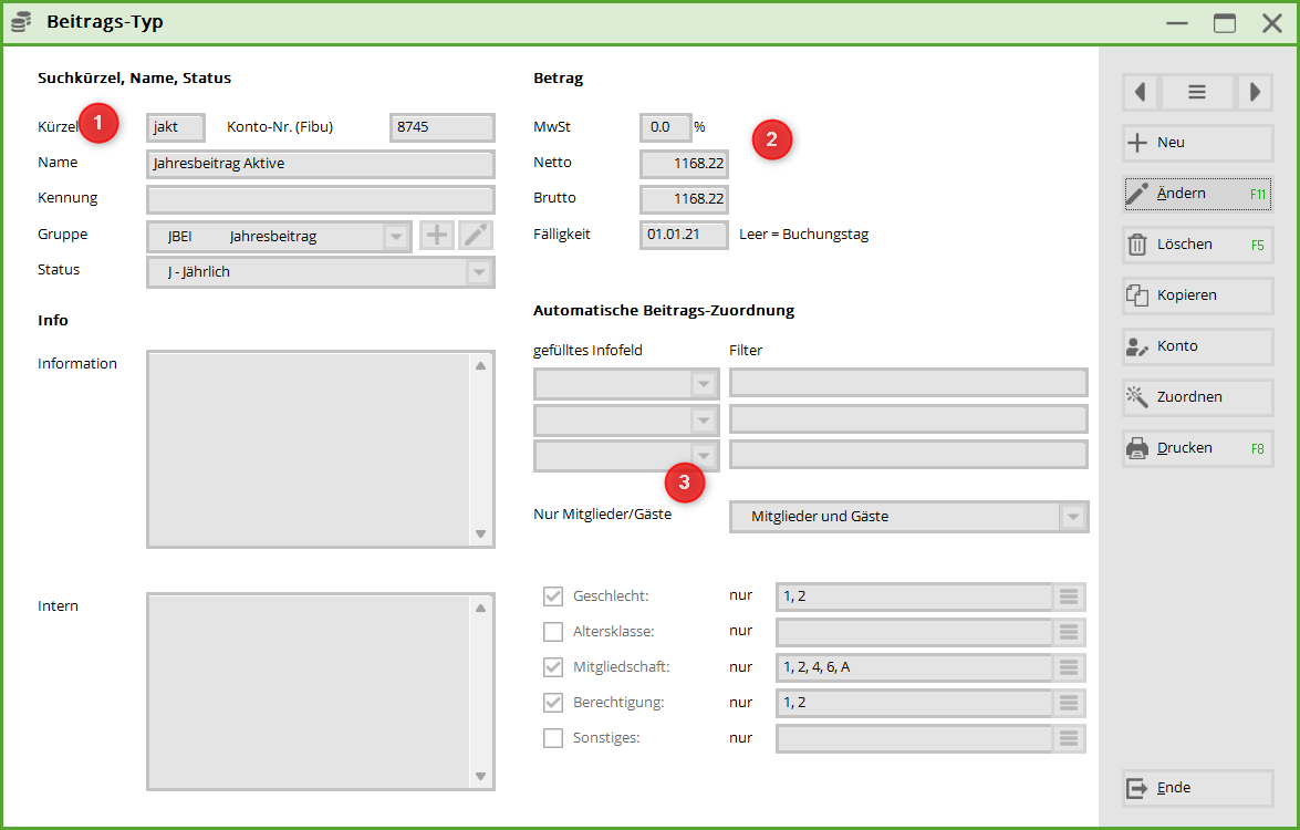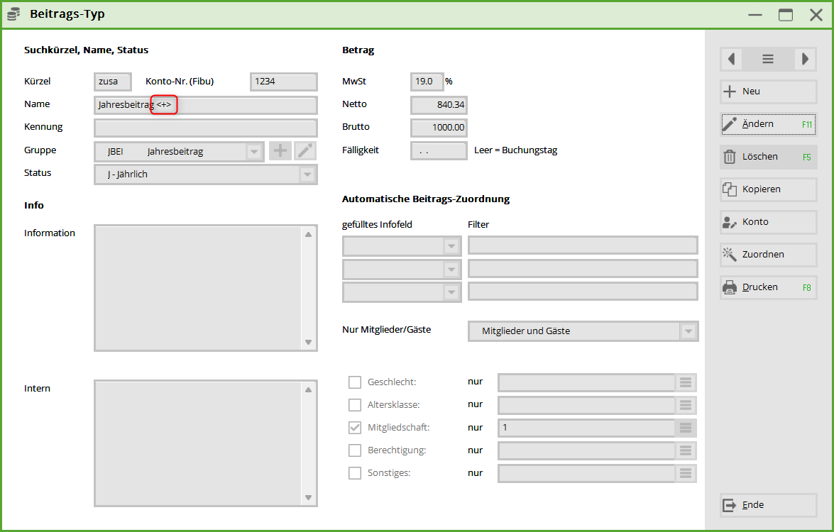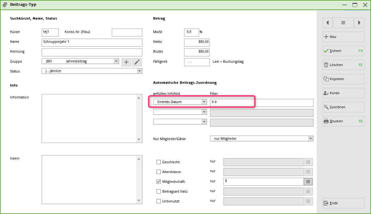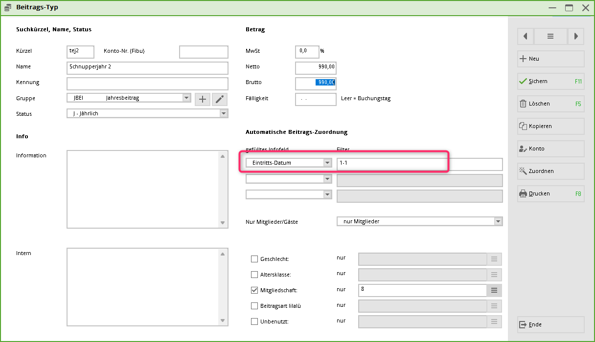Die „Zahlweise“ mit dem Filter „J“ ist nur nötig, wenn es für diese Beispielmitgliedschaft „Vollmitglied Einzel“ auch Monatsratenzahler gibt. Ist dies nicht der Fall, brauchen Sie diese Position nicht zwingend zu füllen.