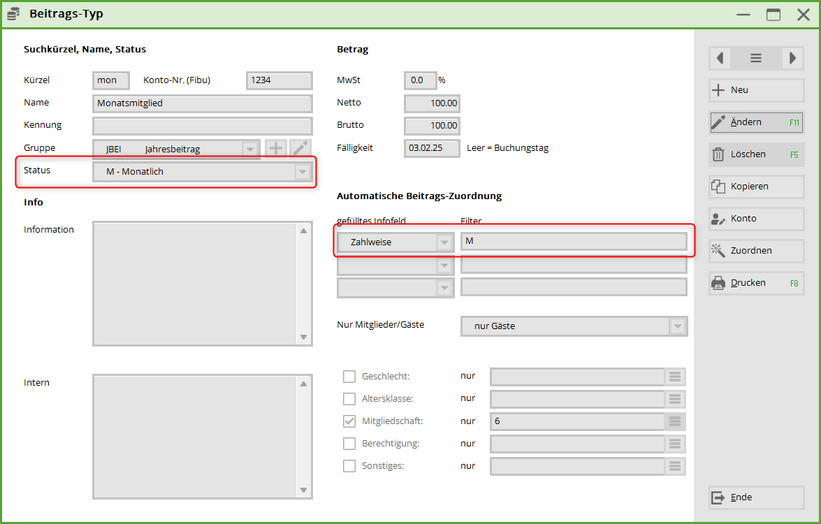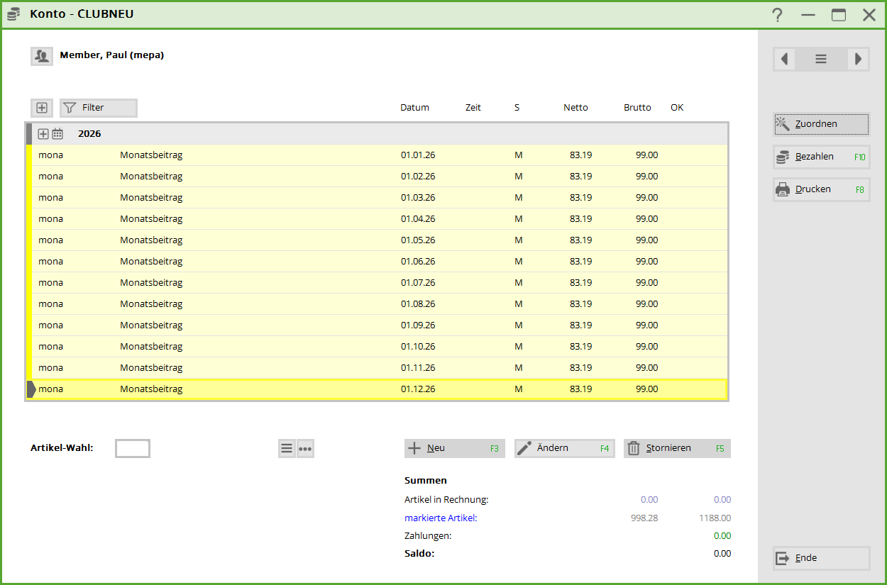 Mit dem Status „Monatlich“ ist dafür gesorgt, dass mit der automatischen Beitragszuordnung diese Artikel 12x pro Jahr (jeden Monat) bei den betroffenen Personen einbuchen werden können. Damit kann später auch der monatliche Einzug gesteuert werden und die Artikel bis zum 31.12. eines Jahres durch gebucht werden: Monatliche Zuordnung