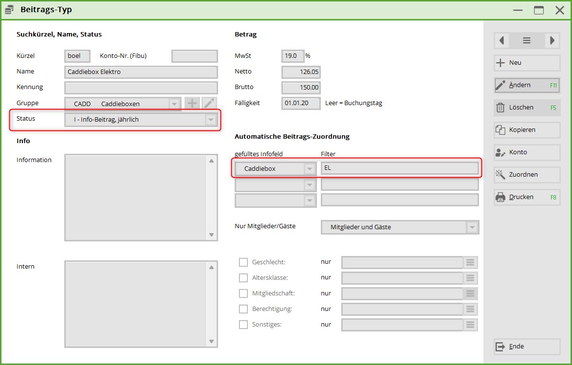 Der Status „Info-Beitrag jährlich“ sorgt dafür, dass mit der automatischen Beitragszuordnung auch die Box-Nummer mit auf die Rechnung gedruckt wird.