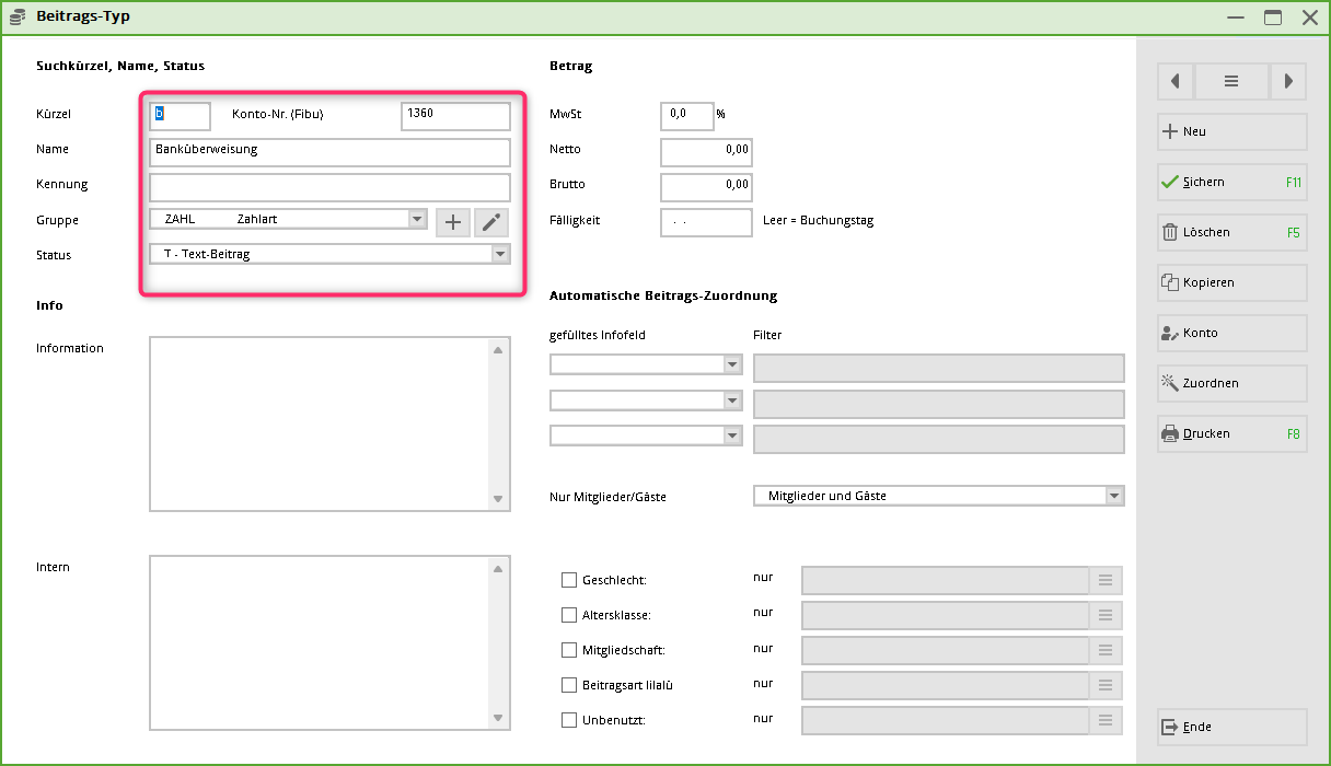 Bitte vergeben Sie ein Kürzel, wählen Sie die Gruppe „Zahlart“, den Namen (je nach Zahlart) und geben Sie den Status „Textbeitrag“ ein. Schon ist Ihre Zahlart fertig.