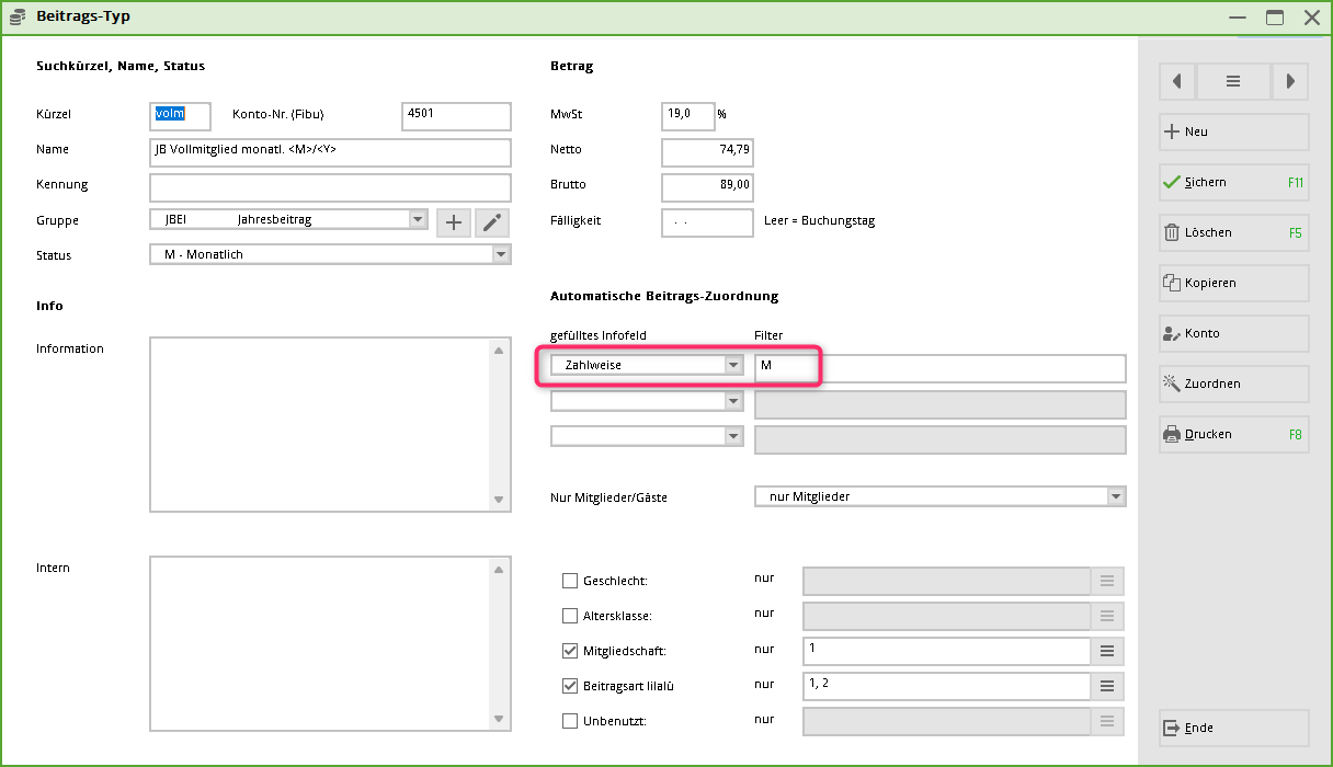 Sie sollten aber darauf achten, dass Sie beim Auflisten der Artikel, die zugeordnet werden sollen nur Monatsartikel eintragen, die ein gefüllten Datumsfeld ausweisen, ansonsten würden die Beiträge bis Ende des Folgejahres gebucht werden, das ist vielleicht nicht gewünscht.