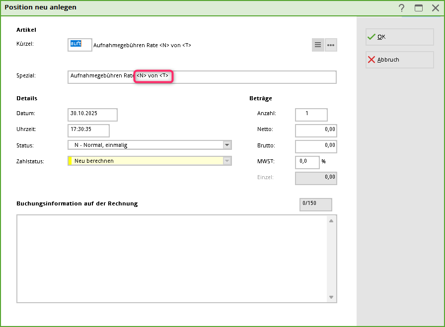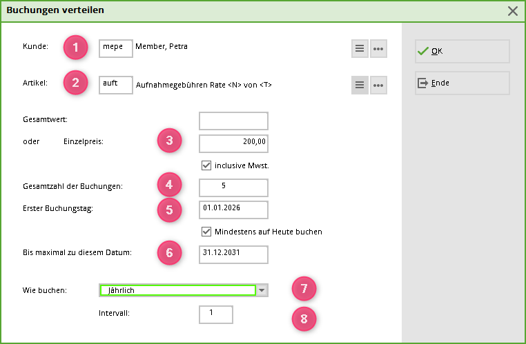Füllen Sie nach Bedarf aus. In unserem Beispiel geht es um eine Aufnahmegebühr, die in 5 Jahresraten zugeordnet werden soll.
