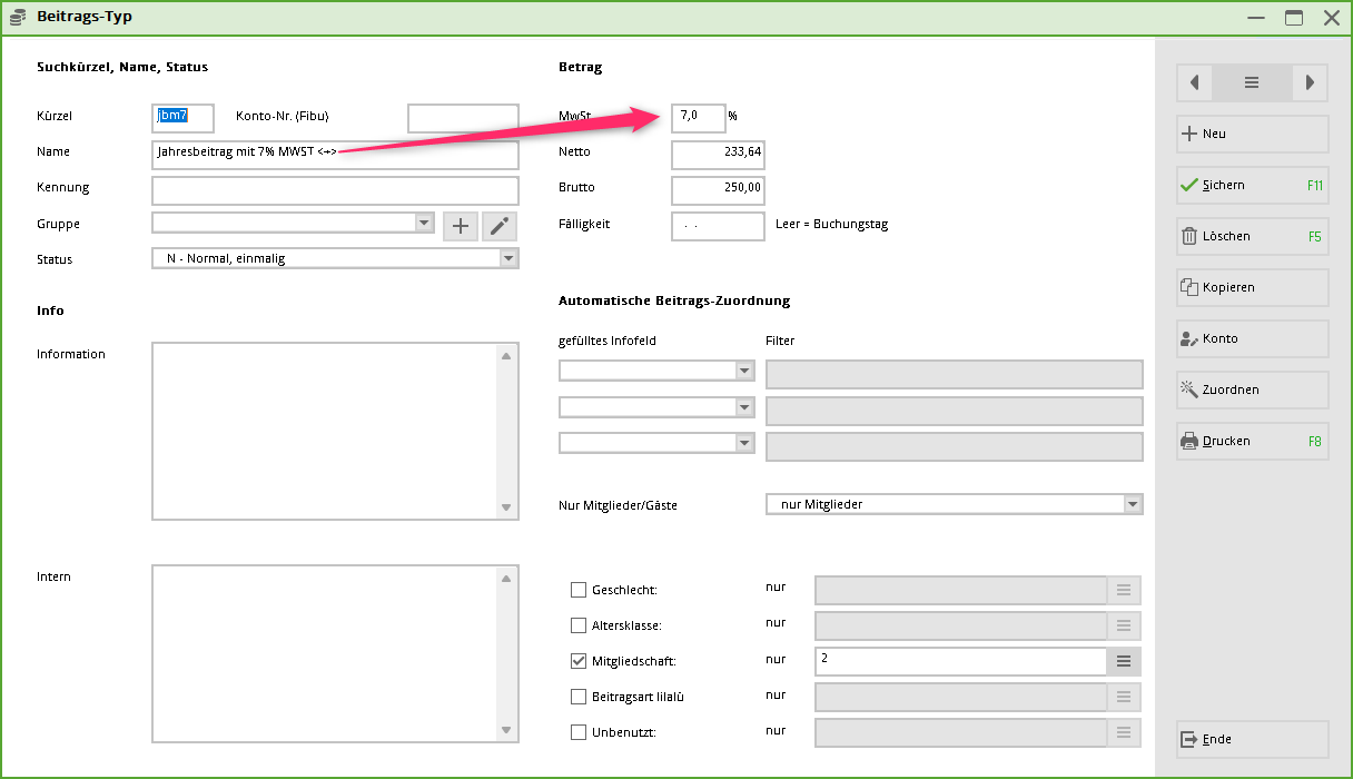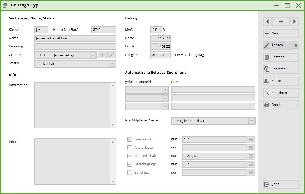 Die automatische Beitragszuordnung wird in den Beitragskonten (z.B. CLUB/GMBH) verwendet und hauptsächlich für Jahresrechnungen genutzt.