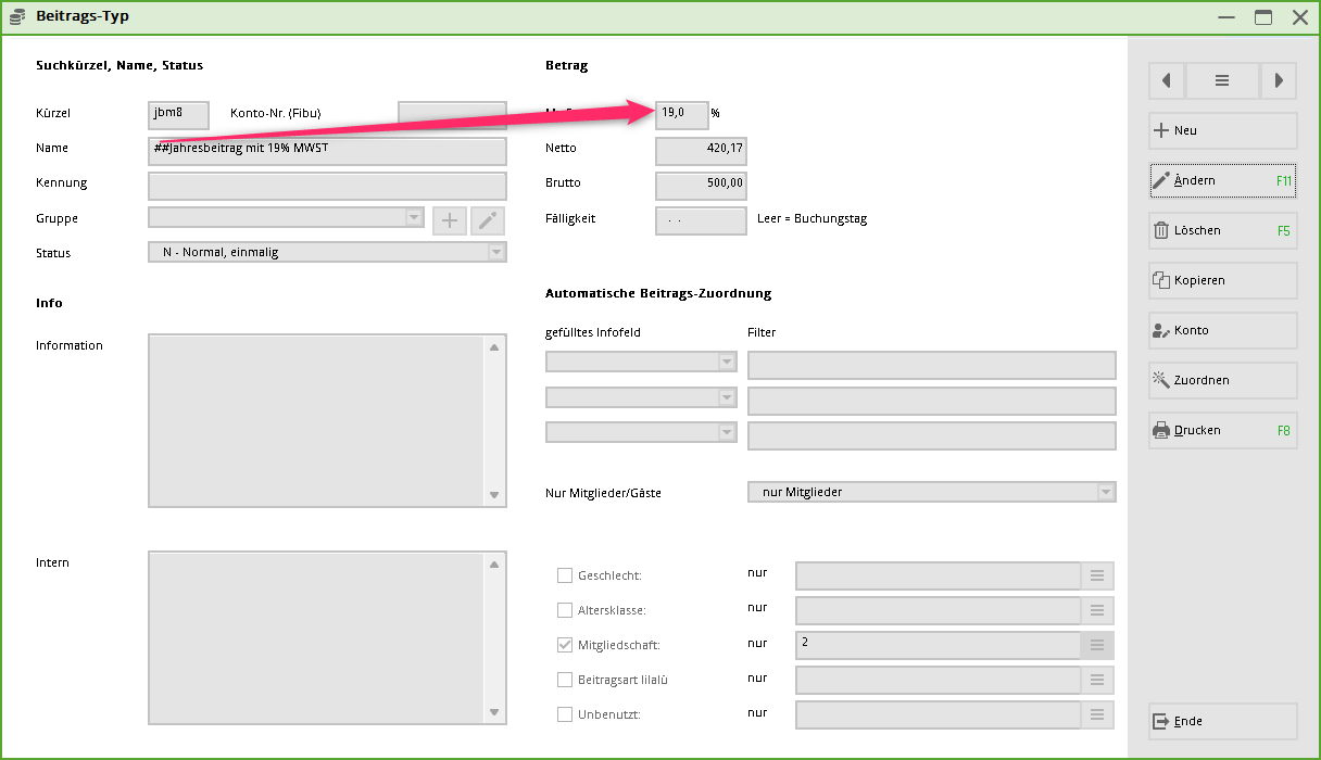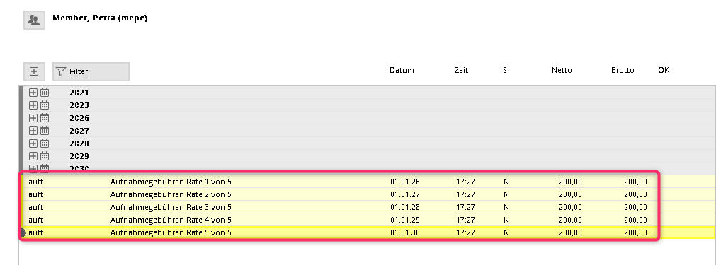Wenn Sie die Beiträge aber ab Eintritt immer für ein Jahr einbuchen wollen, also über den Jahreswechsel hinaus, müssen Sie folgendes eingeben.