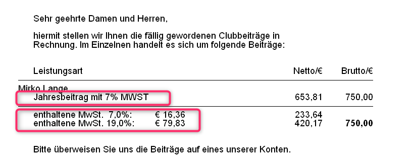 In der Rechnung sind beide Artikel kummuliert und die unterschiedlichen MwST Sätze sind ausgewiesen. Bitte beachten Sie, dass in dem Beispiel der Artikel im Text die 7% MWST eingetragen hat, hier könnte jeder andere Artikelname stehen.