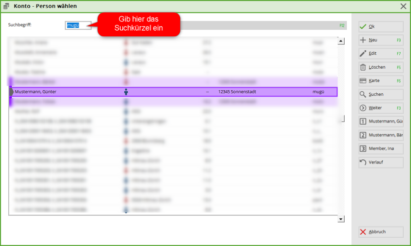Natürlich können Sie auch über die Personenmaske unter Personen/Neu anlegen, bearbeiten, löschen… direkt das Umsatzkonto der gewünschten Person aufrufen.
