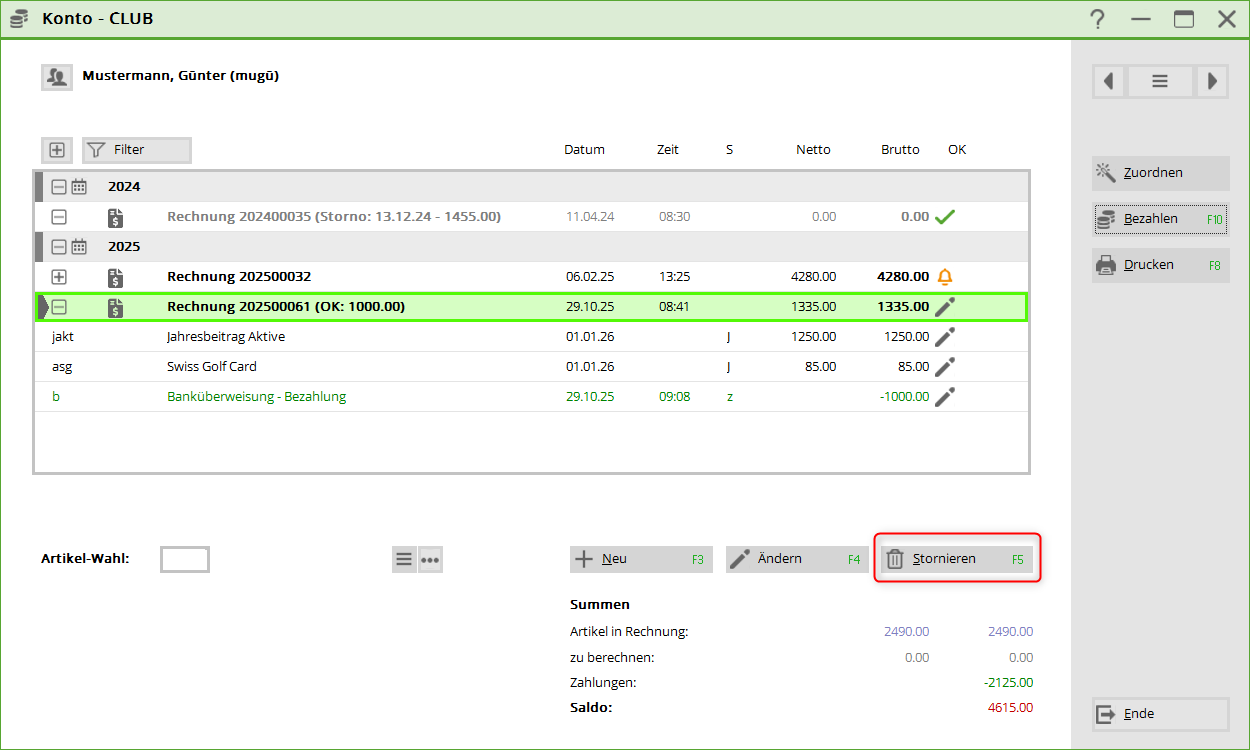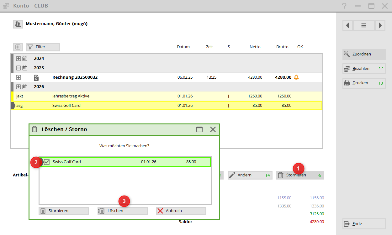 Klicken Sie im Konto auf Storno: