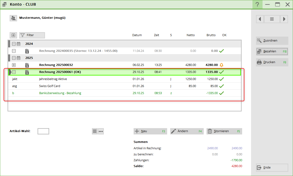 Wenn die Bezahlung mit einem Rechnungsbetrag übereinstimmt, wählt PC CADDIE hier automatisch die passende Rechnung aus, die noch zur Bezahlung aussteht. Sie könnten hier (z.B. bei Teilzahlungen) auch manuell die Rechnung markieren, der die Bezahlung zugeordnet werden soll.