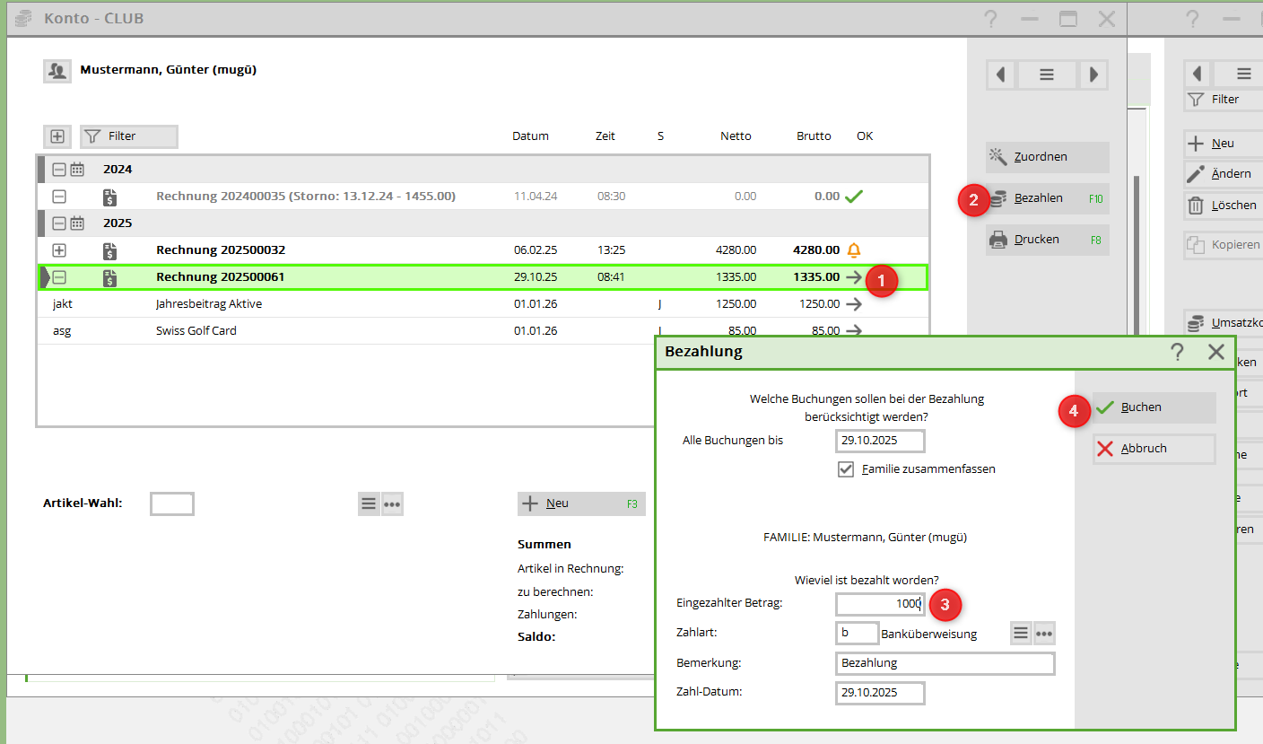Der Kunde hat nicht die ganze Rechnung bezahlt, sondern eine Teilzahlung überwiesen. Wählen Sie die Rechnung an (1) klicken auf bezahlen (2), geben den Betrag ein (3) und klicken auf buchen (4)