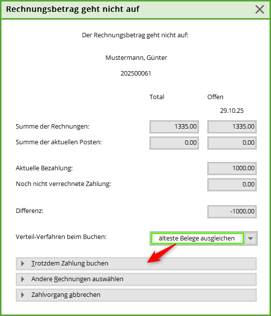 Sie können wählen zwischen „älteste Belege ausgleichen“ oder „gleichmässig verteilen“.