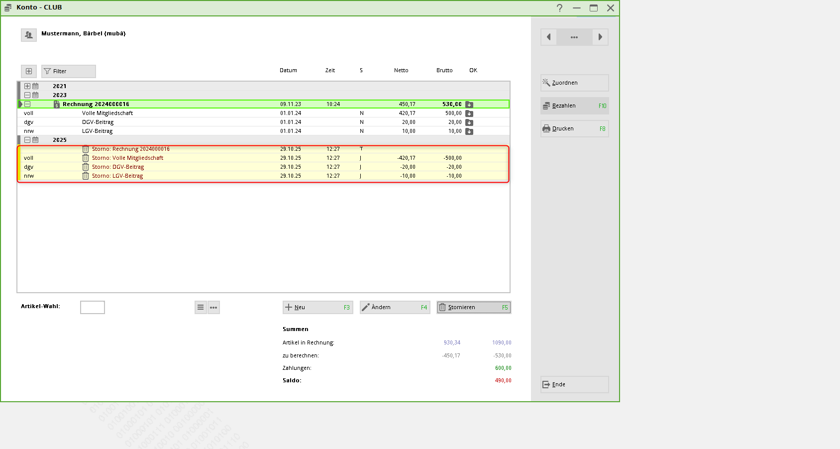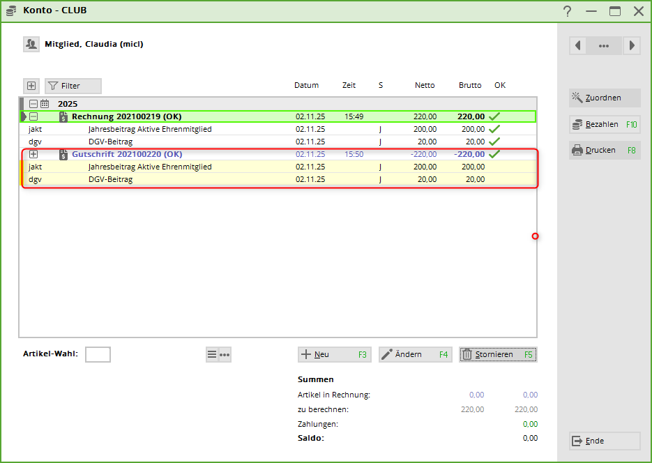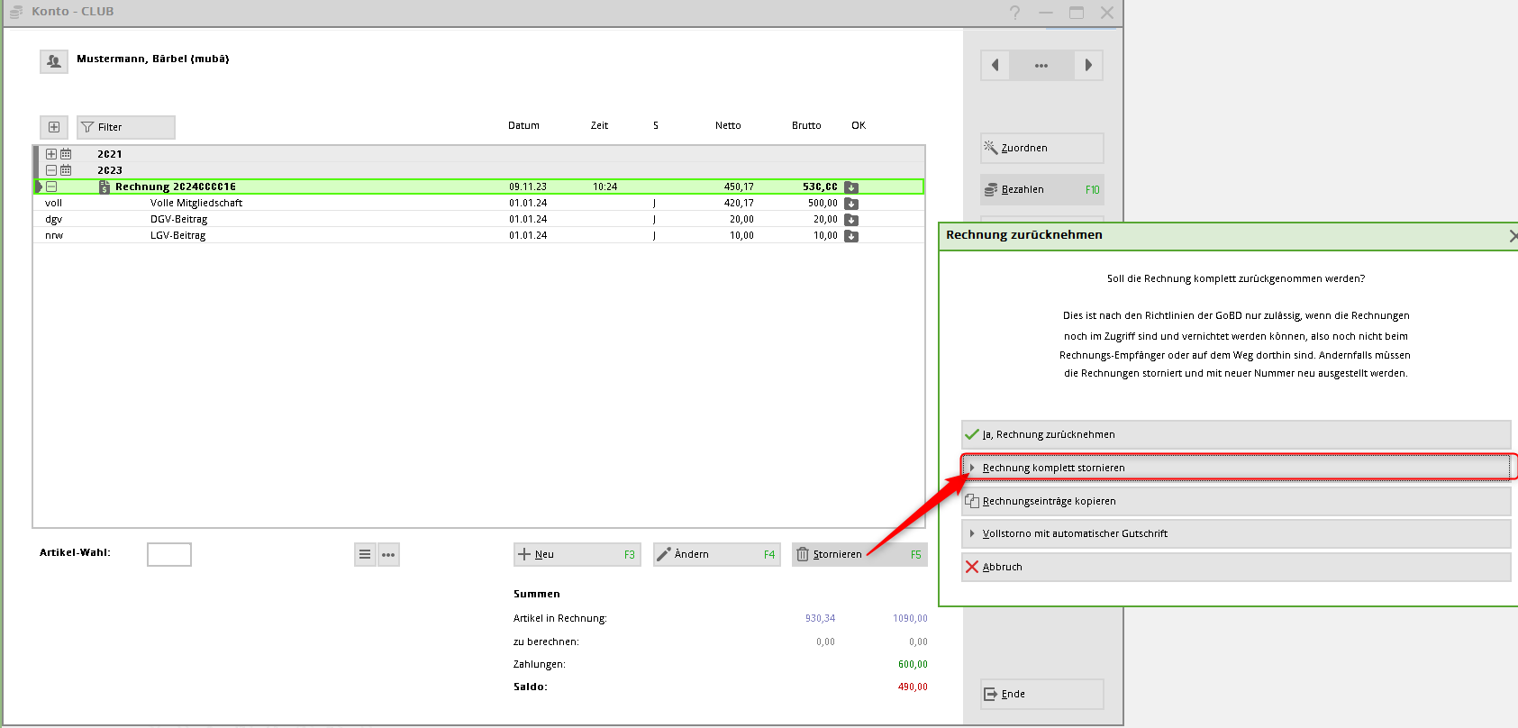 Klicken Sie hier nun auf Rechnung komplett stornieren, sodass sich gelbe Storno-Einträge im Konto ergeben.