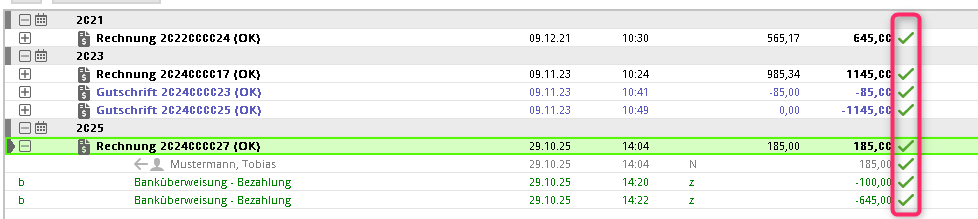 TIPP: Gebuchte Bezahlungen (nur die grünen Einträge) können zu jeder Zeit wieder gelöscht werden. Dies empfehlen wir jedoch nur, wenn Sie die Bezahlung fehlerhaft gebucht haben. Liegt die Buchung der Bezahlung länger zurück, können Sie die Vorgänge im Konto besser verfolgen, wenn Sie den Bezahlt-Eintrag markieren und stornieren.