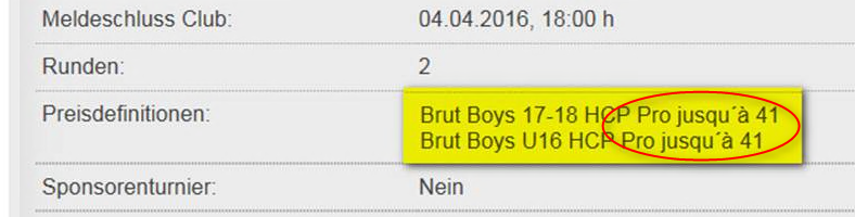 Competitions that were created before the changeover to the EGA-HCP system, or competitions that you have copied from before the changeover, should be checked on the Internet with regard to the price classification display. If the prices for the competition look like in the following screenshot (HCP up to 41 instead of HCP up to – ), it is necessary that you change the edit the price setting in PC CADDIE in each affected tournamentand transfer it to the intranet again (the handicap limit of 41 results from the handicap system used at the time the original tournament was created, when the handicap system was still used up to HCP 36, and therefore cannot be changed automatically):