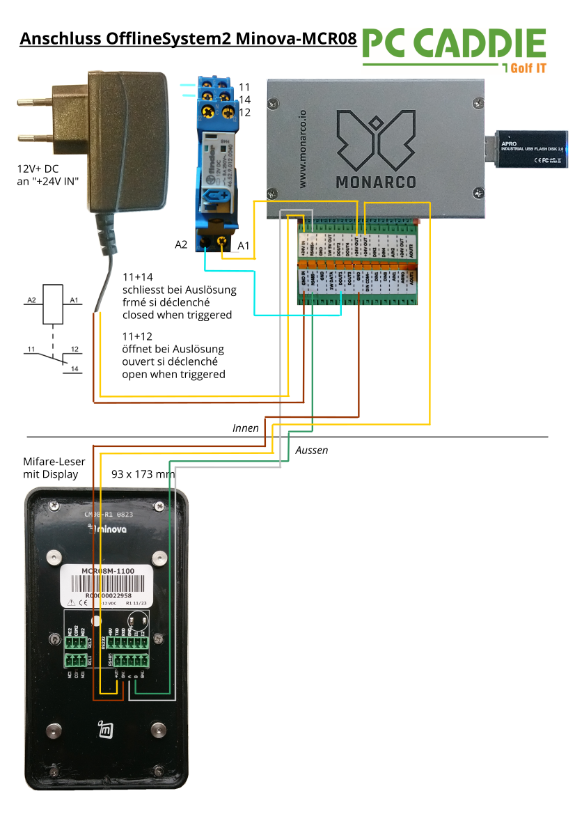 Der Anschluss zum Auslösen der Bälle (für Ballautomaten) oder zum Schalten des Öffner-Magneten (bei Türen) befindet sich auf der schraubbaren Steckleiste der CPU (Mini-PC). Zusätzlich enthält der Quio-Leser ebenfalls ein Relais, welches alternativ zu jenem der CPU verwendet werden kann, wenn Sicherheit nicht oberste Priorität hat.