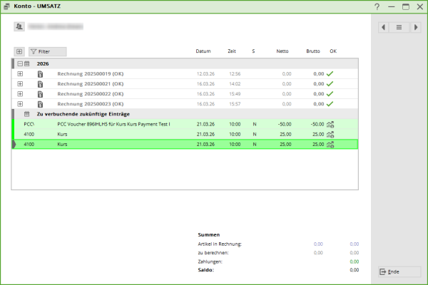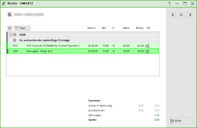Im Konto werden Ihnen der/die Artikel und der Voucher als Zu verbuchende zukünftige Einträge angezeigt. Das Datum ist jeweils das Veranstaltungsdatum.