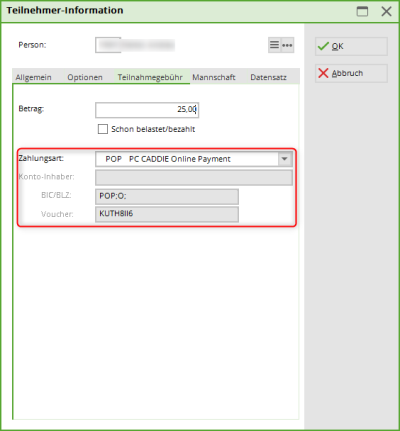 Hat ein Teilnehmer online bezahlt, sehen Sie in der Teilnehmer-Information unter Teilnahmegebühr den Betrag, die Zahlungsart und auch den Voucher.