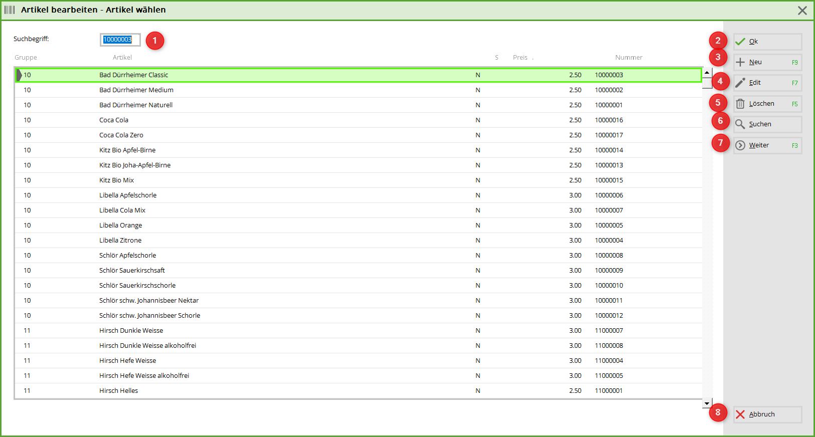 6. Hier können Sie nach Namens-Teil oder Warengruppe Suchen. Die Artikelmarkierung springt auf den ersten Artikel, auf den das Suchkriterium zutrifft.