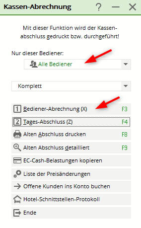 Wenn die Funktion eingerichtet wurde, druckt der X Abschlag für „ALLE BEDIENER“ lediglich die Bediener der jeweiligen Kassennummer! Danach sollt nichts mehr gebucht werden, oder falls das NÖTIG ist, sollte die Abrechnung „ALLE BEDIENER“ wiederholt werden.