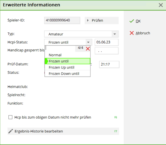 Der Knopf hinter dem Handicap-Index heißt auch bei Gästen und Zweitmitgliedern Details. Durch Klicken dieses Buttons können Sie durch Markieren der Option Hcp bis zum obigen Datum nicht mehr prüfen die Prüfung abschalten.