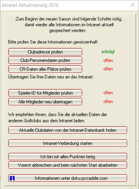 Der Dialog erscheint nach dem Einspielen des Updates, sobald Sie sich in PC CADDIE angemeldet haben, also nach dem Neustart. Bitte arbeiten Sie die Punkte von oben nach unten Schritt für Schritt ab.
