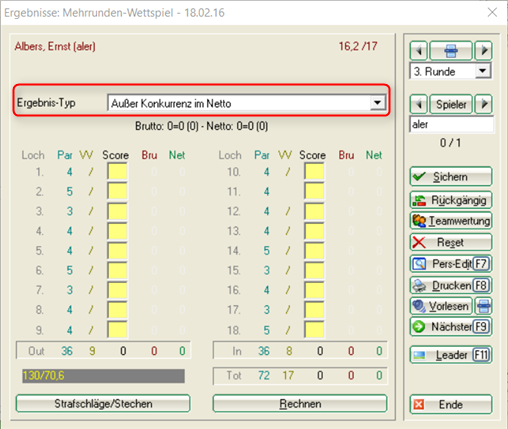 • Bei der Intranet-Gastspielerprüfung werden die Anzahl der gespielten Runden jedoch (aus Datenschutzgründen) über das Intranet nicht mitgeliefert. Gäste werden im Wettpiel automtisch auf Ausser Konkurrenz im Netto eingestellt. Nach Vorlage des Stammblattes durch den Gast sollte das Ergebnis des Gastes auf Lochergebnisse umgestellt werden, damit der Gast auf der Ergebnislite auch seinen Nettopreis erhält.