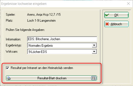 • PC CADDIE warnt beim Druck der 9-Löcher EDS Scorekarte, wenn der Spieler bereits eine 9 Löcher EDS am selben Tag auf demselben Platz gespielt hat. Lesen Sie EDS-Prüffunktionen.