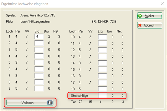 Wenn die Wettspielleitung Strafschläge für die Runde vergibt (die ja nicht dem Ergebnis eines einzelnen Loches dazuzuaddieren sind) so werden Sie im extra Feld eingegeben: Strafschläge für die Runde