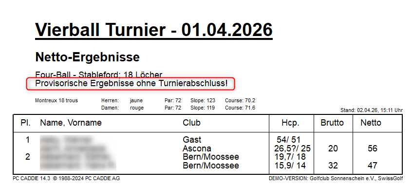 Nachdem Sie den Turnierabschluss gemacht haben, verschwindet der Text „provisorische Ergebnisse…. “ von der Liste, ebenso wenn Sie das Turnier versehentlich auf HCPI Relevant eingestellt hatten und es auf „nicht HCPI Relevant“ umstellen.