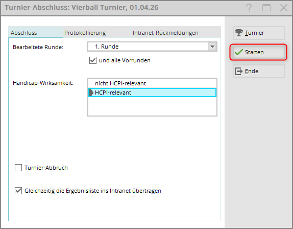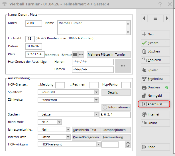 Der Turnierabschluss wird wie gewohnt gemacht, indem Sie auf Abschluss drücken: