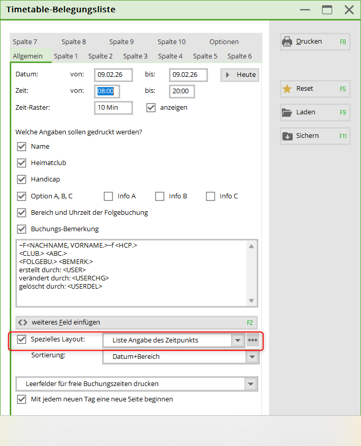 Mit dieser Liste haben Sie die Möglichkeit, eine Liste mit Namen und individuellen Einstellungen für mehrere Bereiche nebeneinander zu drucken. Unter Allgemein nehmen Sie die Grundeinstellung vor und in den Spalten definieren Sie die Bereiche, die aufgelistet werden sollen.
