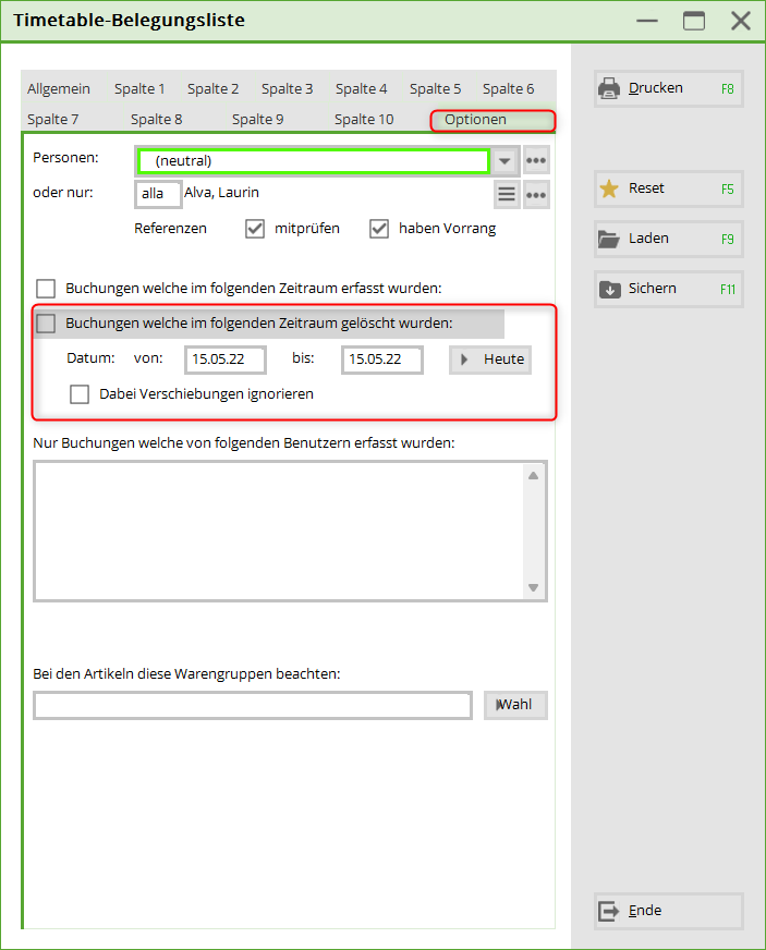 Es ist möglich, diese Liste auch mit Angabe des Zeitpunkts der Veränderung / Löschung der Buchung zu drucken. Dazu definiert man in den Laschen die Grundeinstellungen: