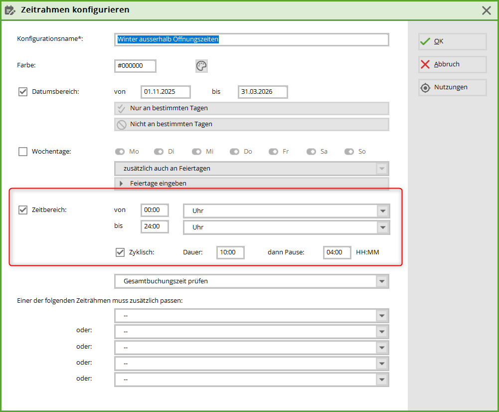 Zeitbereich gilt von 00.00 Uhr bis 24.00 Uhr. Dieser Zeitrahmen gilt für die Dauer von 10 Stunden, also von 00.00 Uhr bis 10.00 Uhr und macht Pause für 4 Stunden, also bis 14.00 Uhr und gilt dann wieder.