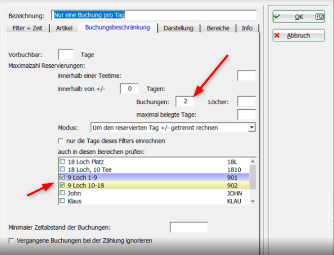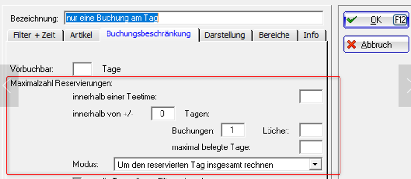 Hier ist definiert, dass am aktuellen Tag (innerhalb von +/- Tagen 0) maximal 2 Buchungen gemacht werden können