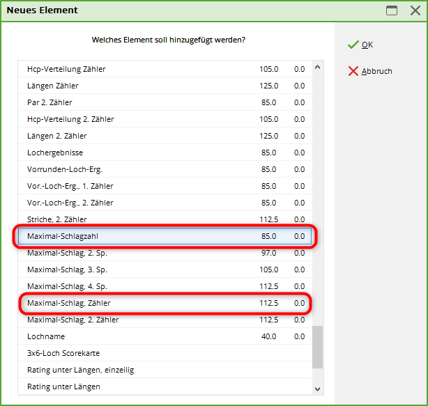 Wenn Sie weitere Angaben in die Scorekarte aufnehmen möchten, können Sie diese nach Klicken von Neues Element (F2) einfügen. Ihre fertigen Einstellungen werden nach dem Bestätigen mit OK automatisch gespeichert. Zusätzlich besteht die Möglichkeit, die Konfiguration mit in Datei speichern unter einem individuellen Namen auf der Festplatte zu speichern. Dadurch haben Sie eine doppelte Sicherheit, schaffen sich eine große Auswahl alternativer Konfigurationen an und können auch die Einstellungen per Diskette von einem Computer zu einem anderen übertragen!