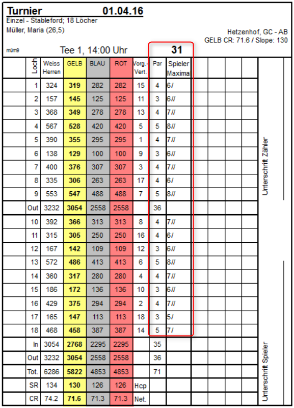 Es gibt die Möglichkeit, die maximale Schlagzahl pro Loch mitzudrucken, bei der ein Spieler noch einen Stablefordpunkt erhalten würde. Besonders für Spieler mit hohen Handicaps ist das sicher eine gute Hilfe. Zusätzlich fördert diese Einstellung den Spielfluss.