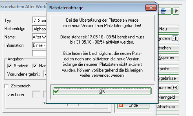 Wenn der Verband ein neues Rating für Ihre Platzdaten zu Verfügung gestellt hat, erhalten Sie beim Scorekartendruck folgende Meldung:
