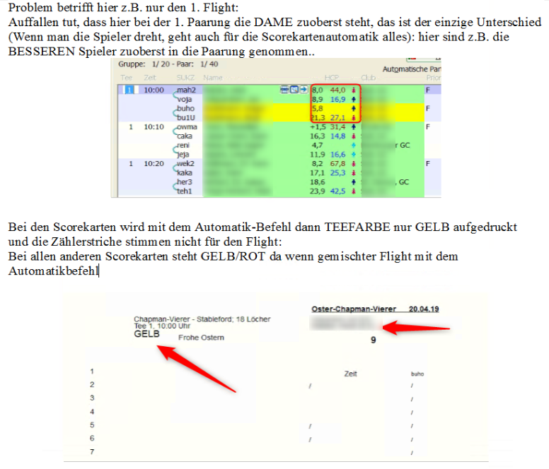 Sehen Sie dieses Beispiel an: Wenn man in Vierern bei gemischten Paarungen einmal den Herrn und ein andermal die Frau als 1. in die Paarung nimmt, hat das Auswirkungen auf die Automatiken der Scorekartenfelder. Hier kann nicht alles in jeder Variante automatisch alles gleich drucken. Das Wettspiel ist dennoch richtig gerechnet.