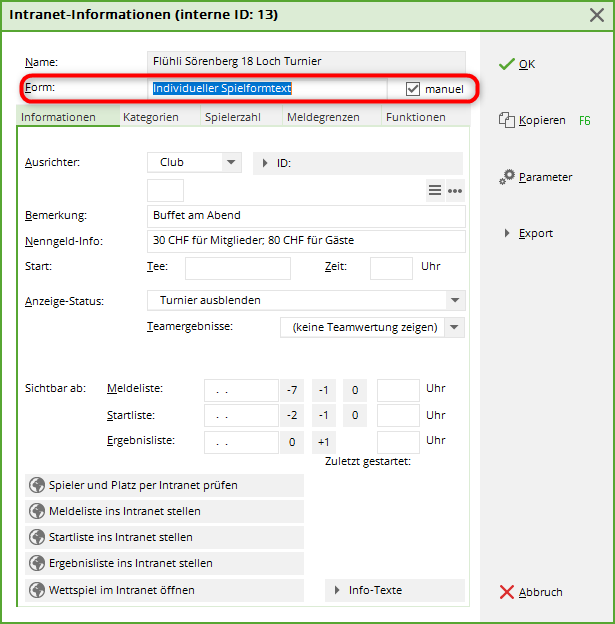 • Über den Anzeigestatus wird definiert, ob ein Turnier überhaupt im Internet publiziert wird oder nicht.