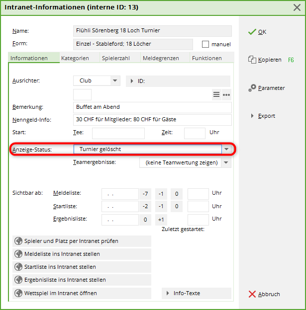 Um das Turnier aus dem Intranet zu löschen, wechseln Sie unter „Informationen“ unter „Anzeigestatus“ auf Turnier gelöscht