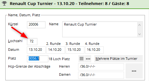 Diese Löcherzahl ist später in der Abwicklung des Wettspiels nirgends zu sehen! Bitte diese Rundenanzahl während des gesamten Wettspiels so lassen! Die individuelle Rundeneinstellung die im Folgenden erklärt wird, funktioniert nur mit der Löcheranzahl, die erst einmal für jede Runde 18 Löcher „denkt“.