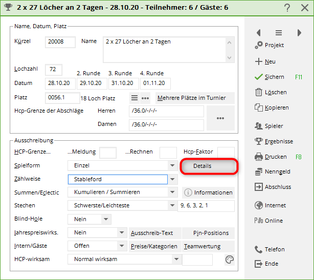 Als Beispiel spielen wir ein Wettspiel mit 4 Runden wobei die 1. Runde über 18 Löcher gespielt wird, die 2. Runde über 9 Löcher, die 3. Runde ebenso über 9 Löcher und die 4. Runde wieder über 18 Löcher.