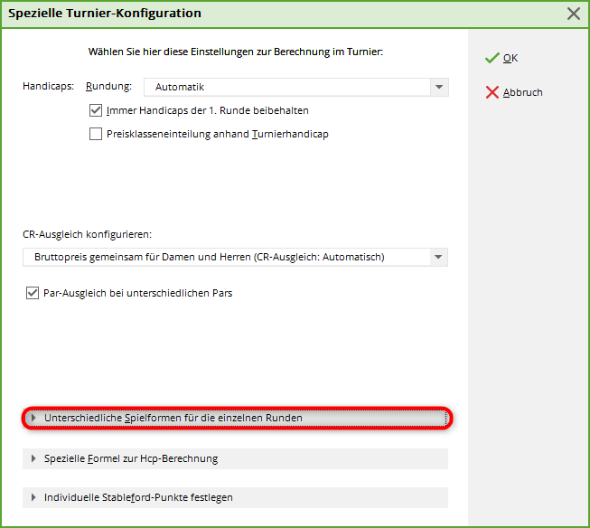 Und jetzt kommen wir zur Einstellung, wo wir festlegen, dass die 2. und 3. Runde nur 9-Löcher Runden sind: