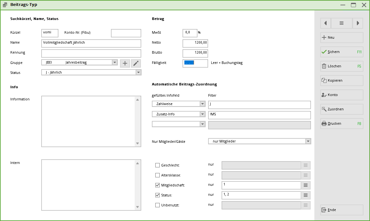 Die automatische Beitragszuordnung wird in den Beitragskonten (z.B. CLUB/GMBH) verwendet und hauptsächlich für Jahresrechnungen genutzt.