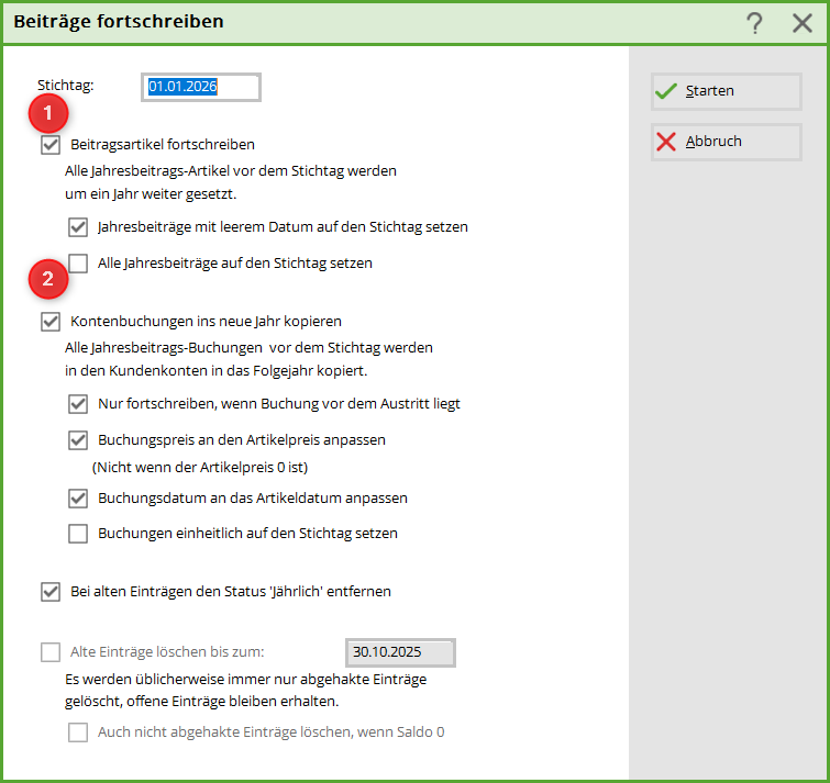 Im Gegensatz dazu bucht man mit der Kontenfortschreibung alle Artikel mit jährlichem Status in die Konten, die genau so auch letztes Jahr in den jeweiligen Konten waren. Alle Änderungen von Mitgliedschaften müssten hier manuell bearbeitet werden. Hierfür ist der Haken (2) im Bild verantwortlich.