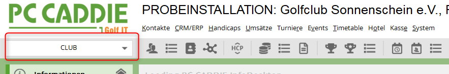 Sie können den Kontenbereich wechseln, indem Sie auf Umsätze/Kontenbereich wählen klicken oder über die Tastenkombination STRG+F2, oder aber auf der PC CADDIE Hauptmaske auf den gelben Button klicken, in dem bereits ein Kontenbereich eingestellt ist.