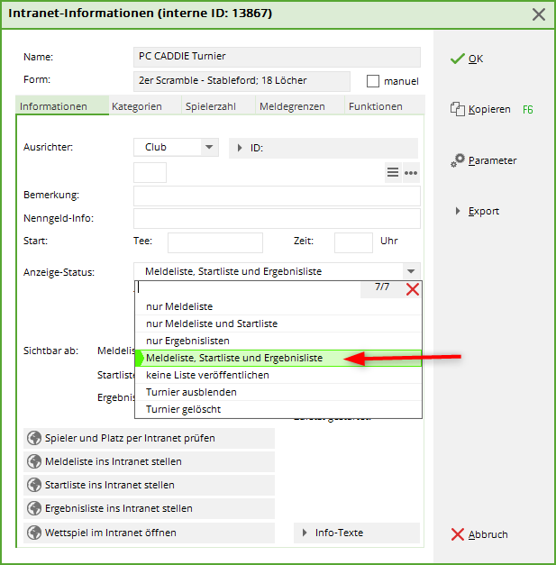 button to access the tournament's internet settings. Define here whether this competition should be put online at all, and if so, to what extent.