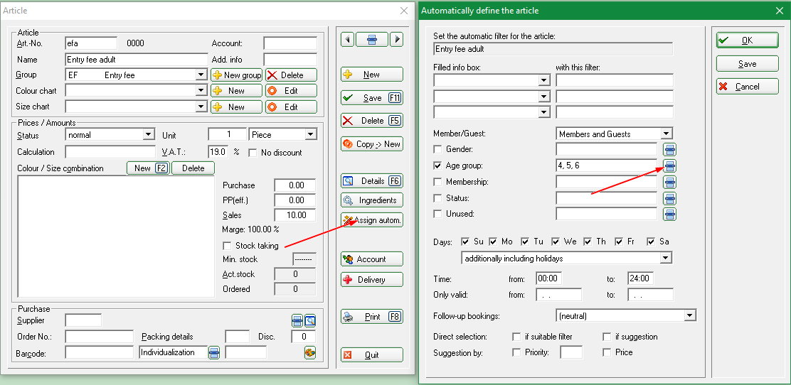 If you click on „Automatic“ in the article, you can set who the entry fee applies to. In the betting game, you can then adjust the price for the betting game under entry fee so that you only need 1 entry fee article for adult players.